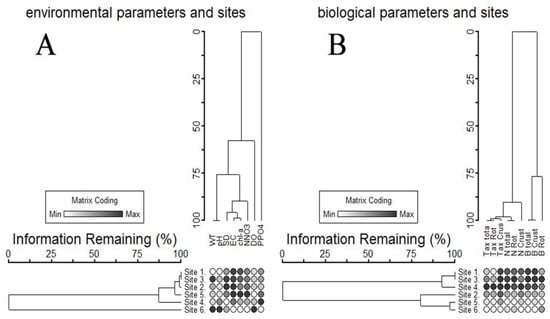 Two-way cluster analysis compared the environmental parameters and group of sites (Figure 7A). The dendrogram showed a good division between average water temperature and pH, as well as between Secchi disk visibility, conductivity, and chlorophyll. In terms of environmental parameters, the Brda River was significantly different from the water in canal sites. The parameters at site 4 were also different from those found at the other sites of the Bydgoszcz Canal. We used two-way cluster analysis to compare the biological parameters (zooplankton data) at the studied sites (Figure 7B). The dendrogram showed a good division between number of zooplankton species, total zooplankton density, and biomass. The cluster analysis divided sites into two groups: the first group comprised the Bydgoszcz Canal (sites 1, 3, and 4), and the second group comprised the Brda River (site 6) with the Noteć Canal and site 2 from the Bydgoszcz Canal (site 5) (Figure 7B).