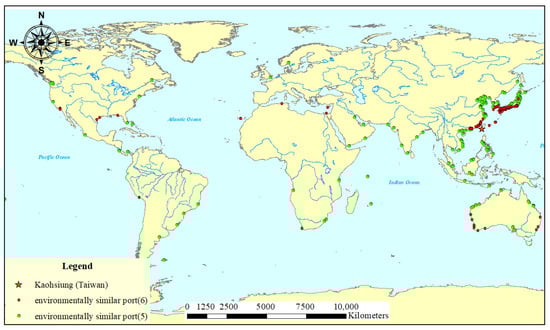 The environmental similarity in IMO’s guidelines of BWM Convention was utilized to assess the last ports of call with a similar salinity and temperature to the two target ports in this study [,,,]. The temperature of the global environment was divided into four major temperature regions: tropical, warm-temperate, cold-temperate, and Arctic/Antarctic (Polar) according to the world’s oceans. The temperature similarity between the source port and the target port determines the risk score. For example, the port of Kaohsiung is in a warm-temperate region, so the donor ports that are also warm-temperate are highly similar ports, indicating a higher risk for HOAP invasion. The risk of invasion was categorized as high, moderate, and low with scores of 3, 2, and 1, respectively (see Table 1). The salinity of the port of Kaohsiung is 30.7–33.4. If the difference between the salinity of the donor port and port of Kaohsiung was less than 3, it was listed as a highly similar port; a difference of 3–5 was considered a moderately similar port; and a difference of greater than 5 was considered as a less similar port. The risk score for invasion was given as 3, 2, and 1, respectively (see Table 1). A similar evaluation criterion was also established for the port of Riga. Furthermore, in the first stage of the risk assessment, the donor ports with five-point and six-point scores obtained by the two environmental factors (salinity and temperature) were the environmentally similar ports.