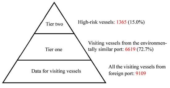The BWM Convention requires all ships to implement a ballast water management plan [,]. All ships must carry a ballast water record book and are required to carry out ballast water management procedures to a given standard. Parties to the Convention are given the option to take additional measures, which are subject to criteria set out in the Convention and by IMO guidelines. Implementation of the BWM Convention requires concerted international action involving different types of expertise to solve various technological, environmental, and socio-economic problems related to the ballast water management [,,,]. However, insufficient information regarding the risk of vessels related to ballast water will become a problem for implementing port state control (PSC). In this study, the environmental similarity and the characteristics of vessels as risk factors were utilized to establish a two-stage risk assessment for incoming vessels to two regional hubs, i.e., the port of Kaohsiung and port of Riga. Through the two-tiered screening processes of risk, the priority for PSC inspection can be established for all incoming vessels for better ballast water management. These inspections may include verifying valid documents, and/or sampling of the ship’s ballast water to meet the BWM Convention’s D-2 performance standard [].