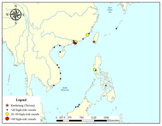 In the tier-two risk assessment, the empirical risk model was used to further assess the incoming vessels from the environmentally similar ports. Figure 2 shows the results of the two-tier risk assessment performed for the vessels that visited the port of Kaohsiung during 2013–2015. As shown in Figure 2, there were 1365 vessels in the high-risk category, representing about 15% of all visiting vessels. Figure 3 and Table 5 reveal that all the donor ports of high-risk vessels are located in Asian countries near the port of Kaohsiung. In Table 5, it can be seen that the donor ports with the highest number of high-risk vessels were the port of Hong Kong, followed by the port of Subic Bay in the Philippines, and the ports of Yantian and port of Ximen in China. The ships from these ports have a higher risk level because of the similar environmental conditions and shorter voyage time. The port of Hong Kong is the most frequent last port of call, accounting for 1073 arrivals during the study period. According to the results of this study, an average of about 1.2 high-risk vessels visited the port of Kaohsiung each day during 2013–2015. The two-tiered risk assessment helps the PSC officers to pick up the vessels that may possess more risk based on all the well-documented rick factors shown in the literature.