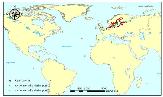 Location of the donor ports with similar environments to the port of Riga. The red and green solid circles represent ports with a risk score of 6 and 5, respectively, based on the criteria set in Table 1.