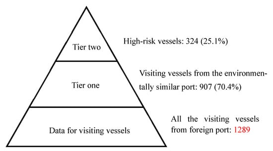 The commercial shipping transit information for all the vessels arriving in the port of Kaohsiung and Riga during 2013–2015 was retrieved from the respective port authorities. Transit information from these international arrivals includes the date of entry, vessel name, IMO number, flag, type of vessel, port of origin, last port of call, next port of call, voyage routes, gross tonnage (GT), net tonnage (NT), and deadweight tonnage (DWT). In this study, two-tiered risk analysis was performed for the incoming vessels to the port of Kaohsiung and Riga, based on the environmental similarity in IMO’s guidelines and the empirical model established in a previous study [,,].