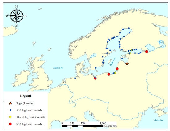 Location of the donor ports of high-risk vessels that visited the port of Riga. The blue, yellow, and red solid circles represent donor ports where the high-risk vessels originated from. Each color corresponds to the number of vessels <20, 20–60, and >60, respectively.