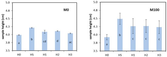 Sample height measured for M0 and M100 samples after preparation (H0), at initial saturation (HS), at the beginning of wetting (H1), at the end of wetting (H2), and at the end of drainage (H3).