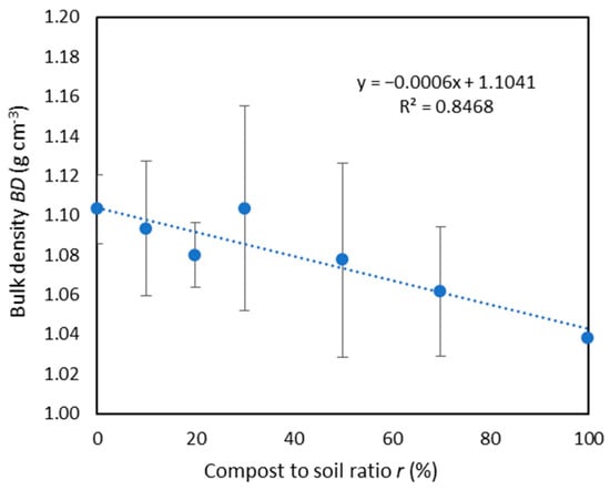 The BD values measured at the end of the wetting–drainage cycle (H3) ranged from 1.03 to 1.14 g cm−3 with a mean value of 1.08 g cm−3 (CV = 3.10%). Independently of the compost to soil ratio, the soil BD was always within the range of BD values considered as optimal for field crop production (0.90 ≤ BD ≤ 1.2 g cm−3) [31,43]. A significant negative correlation (p < 0.005) was found between the sample bulk density and the compost percentage (Figure 3). Similar results were reported by Khaleel et al. [49] and Eden et al. [39] in their review articles on the long-term effects of organic waste recycling in agriculture. Mandal et al. [4] obtained a linear decreasing BD relationship for a silt loam soil amended with composted poultry litter up to 40% v/v. However, a closer examination of the plot also highlights that a threshold type behavior for BD vs. r relationship could be supposed. In particular, compost addition seems to have no effect on BD until a threshold value of r = 30% is reached. Afterward, the soil BD decreases at increasing r value. Such a different soil response was observed, among others, by Reynolds et al. [26] for the short-term effects of a single high rate addition of yard waste compost to a clay loam soil. They found significant differences only at the highest compost rate application, i.e., 300 t ha−1, whereas 75 t ha−1 and 150 t ha−1 produced negligible or small improvements relative to the control. Similarly, Brown and Cotton [50] observed significant changes of a loamy soil BD only for application rates higher than 168 t ha−1.