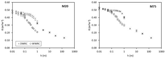 The wetting–drainage water retention curves exhibited a typical hysteretic behavior with volumetric water content at a given pressure head that was always lower for the wetting curve, θW, than the draining one, θD. As an example, Figure 4 compares the wetting (WWRC) and draining (DWRC) water retention curves obtained for M20 and M75 mixtures. The two curves were practically coincident close to saturation (h ≥ −0.05 m). At lower h values, the differences between θD and θW first increased up to a maximum 0.156 m3m−3 at h = 0.50 m and then tended to decrease but remained as high as 0.135 m3m−3 at the lowest h value measured with the tension apparatus (h = −1 m).