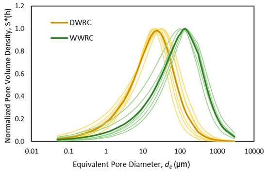 According to the observed differences between the pore volume distribution curves, the location parameters (dmedian, dmode, and dmean) obtained from the WWRC were larger than the DWRC. In particular, the median diameter of water-filled pores during sorption (dmedian = 95 μm) is larger than the draining ones (dmedian = 18 μm) in agreement with the hysteresis theory (Figure 5). Indeed, during a drainage process, the soil holds water in relatively smaller pores whereas the water entry process takes place, on average, at lower suction heads (i.e., larger pores). The shape parameters of the pore volume distribution functions were more similar but a tendency to increase SD and decrease SK for the WWRC was observed (Table 3). The mean pore volume distribution function was in both cases skewed towards small pores (SK < 0) whereas the two curves were classified as leptokurtic, i.e., more peaked in the center and more tailed in the extremes than the lognormal curve (KU > 1) [25].