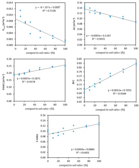 The significant correlations between the capacity-based SPQ indicators estimated from the DWRC and the compost ratio, r, strengthened the reliability of the procedure that estimates the soil physical quality from the water release experiments (Table 3). A significant reduction in Pmac and AC and an increase in PAWC, RFC, and Sindex was observed (Figure 6) that was attributed to an increase in micropores and a decrease in macropores associated to the modification of pore volume distribution. Similar results were observed in literature with PAWC that increased [18] or was practically unaffected by compost addition [3]. On the other hand, many studies showed long-term benefits on AC that increased up to 26% in a fine-textured soil [26] and 15% in a loamy sand [3] when food waste compost was used. Our results lead to the conclusion that short-term organic matter incorporation probably increased micropore volume as a consequence of compost mineral residue (13.7% of particles less than 2 μm in diameter) but had negative effects on macroporosity.