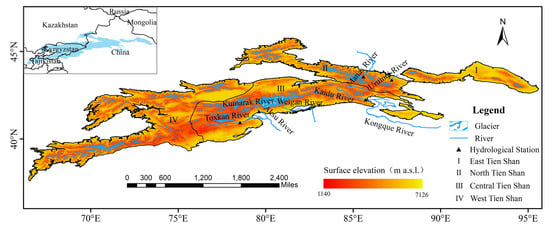 Since the 1980s, the climate in Northwest China has experienced a transition from warm-dry to warm-wet [1]. The glacier melting in the Tien Shan Mountains of Central Asia has accelerated due to the increased temperature, leading to changes in runoff components and amount [2,3,4]. Glaciers, known as “solid reservoirs”, are the headwaters of some major rivers, such as Tarim River, Ili River, Amu Darya, and Syr Darya, in the arid Central Asia and are also one of the critical means of sustaining downstream communities [5,6,7]. It is of great significance to study the glacier change in the Tien Shan Mountains of Central Asia for sustainable socioeconomic development, the rational allocation and management of water resources, and regional water security in this area.