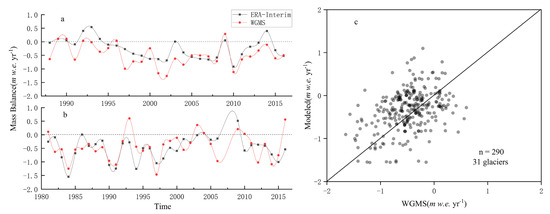 Accuracy evaluation of the PyGEM simulated data. Comparison of the average annual mass balance between the PyGEM-Interim simulated data and WGMS observed data. (a) Urumqi Glacier No. 1 E-Branch during 1988–2016, (b) Ts.Tuyuksuyskiy during 1981–2016, and (c) all the 31 glaciers.