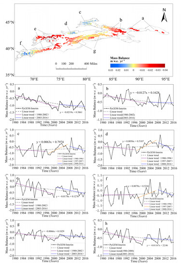 Spatial distribution (top panel) and temporal variations (a–h) in the mass balance of Tien Shan glaciers from 1980 to 2016. (a) East Tien Shan; (b,c) central and eastern, western in North Tien Shan; (d–f) northeast, central, southwest in West Tien Shan; (g) Central Tien Shan; and (h) total.