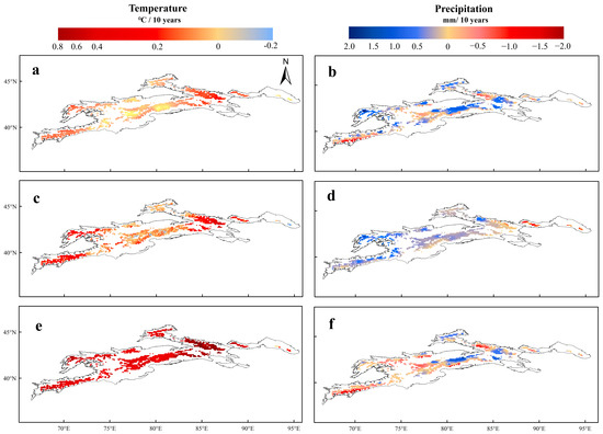 Variations in the linear trend of temperature and precipitation for annual average (a,b), the accumulation period from October to March (c,d), and the ablation period from April to September (e,f) in the Tien Shan Mountains.