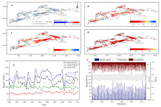 Change in glacier runoff and impact factors in the Tien Shan Mountains from 1980 to 2016. Spatial distribution (a) and temporal variations (e) of glacier runoff; spatial correlations between glacier runoff and glacier area (b), temperature (c), and precipitation (d) from 1980 to 2016; The monthly temporal variation trend of glacier runoff and influencing factors (f).