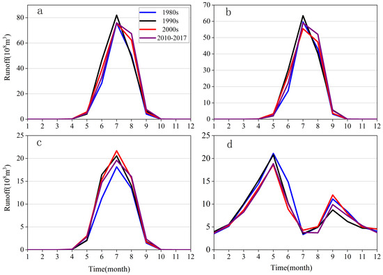 The intra-annual and interdecadal changes that were recorded in the glacier runoff show that the maximum melting time of the glaciers had not changed in July; however, an obvious increasing trend in glacier melt was observed in August. Under the joint action of the higher melting rates and the increased liquid precipitation during August, the glacier runoff also increased, and the solid precipitation decreased. This finding is consistent with the previous research by Deng et al. [40].