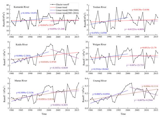 Taking the six rivers that are distributed on the northern and southern slopes of the Tien Shan Mountains as the representative rivers, the inter-annual variations in glacier runoff was investigated. Similarities and differences both can be found among the watersheds (Figure 8). The similarity is that the glacier runoff in all six rivers showed an obvious increasing trend before 2002. Among them, the increased rate of glacier runoff in the Kumarak River was the highest, reaching 2.45 × 108 m3/10a, and that of Urumqi River was the lowest, at only 0.87 × 108 m3/10a. After 2002, however, the increasing rates of glacier runoff in some rivers decelerated or showed downward trends. For example, the glacier runoff in the Kaidu River and Urumqi River showed an obvious downward trend, with the increasing rate of −1.033 × 108 m3/10a and −0.075 × 108 m3/10a, respectively. The glacier runoffs that were measured in Tuoxkan River and Weigan River were relatively stable, showing weak downward trends. In the Kumarak River and Manas River, glacier runoff still showed increasing trends, but the increase rates were significantly lower than those that were measured before 2000. In general, the glacier runoff that was measured in watersheds with higher glacier proportions generally still showed upward trends, but in watersheds with lower glacier proportions, the glacier runoff displayed non-significant increasing trends or even obvious downward trends.