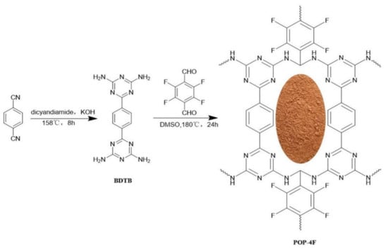 The synthesis of POP-4F was carried out based on previous literature [] with slight modifications (Figure 1). 1,4-bis-(2,4-diamino-1,3,5-triazine)-benzene (1185.2 mg, 4 mmol), 2,3,5,6-tetrafluorotelephtal aldehyde (824.4 mg, 4 mmol) and DMSO (50 mL) were added sequentially in a 100 mL two-necked round-bottom flask and mixed well. The reaction was then heated to 180 °C under a nitrogen atmosphere for 24 h. The reaction flask was then cooled naturally to room temperature. The solid obtained was filtered and washed with DMSO and methanol. Soxhlet extraction with methanol was carried out for 24 h and then dried under vacuum at 120 °C to afford POP-4F as an orange powder in 79% yield.
