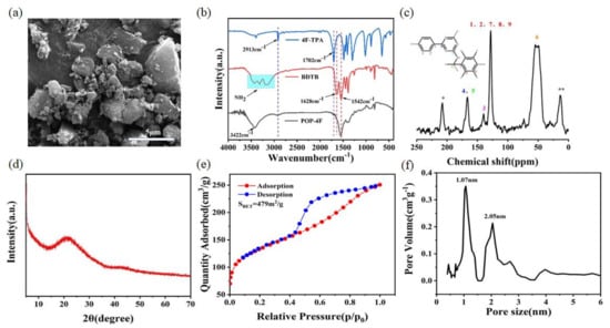 Characterization of POP-4F. (a) SEM; (b)FT-IR; (c) solid-state 13C NMR; (d) XRD; (e) N2 adsorption-desorption isotherms; (f) Pore size distribution.