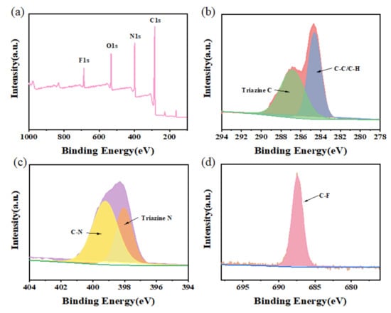 To gain insight into the local chemical environment, X-ray photoelectron spectroscopy (XPS) was conducted (Figure 3). The low-resolution XPS spectra demonstrated the existence of C 1s, O 1s, F 1s, and N1s (Figure 3a). The high-resolution XPS spectra of the C 1s spectrum (Figure 3b) could be deconvoluted into two peaks at 284.6 and 286.8 eV, which were assigned to C–C/C–H and triazinic C–N species, respectively. The high-resolution XPS spectra of the N 1s spectrum (Figure 3c) could be deconvoluted into two different peaks at 398.0 and 399.2 eV, which were assigned to nitrogen-atoms of triazinic and secondary amines, respectively. There is only one peak in the F 1s spectrum (Figure 3d), relative to the material containing only one type of fluorine. Whatmore, the presence of large amounts of F and N again indicates that the reaction was successfully carried out.