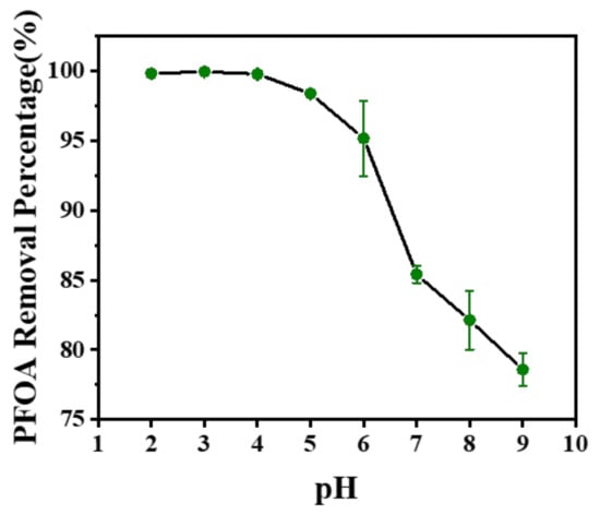 The effect of pH on the removal of PFOA at initial concentrations of 1 mg L−1, an adsorbent dose of 200 mg L−1, and contact time of 24 h. Vertical error bars represent standard deviation from triplicated experiments.
