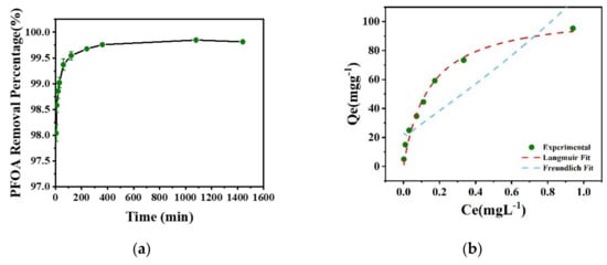 Adsorption isotherm experiments at 298 K were performed to better understand the PFOA adsorption process and evaluate the adsorption capacity. The results of these experiments were analyzed using Langmuir isotherm and Freundlich models. As shown in Figure 5b, the Langmuir model fits well with the experimental data (R2 = 0.98), which indicates the dominant role of monolayer adsorption. In addition, the estimated capacity of POP-4F was 107 mg g−1 based on the Langmuir fit.