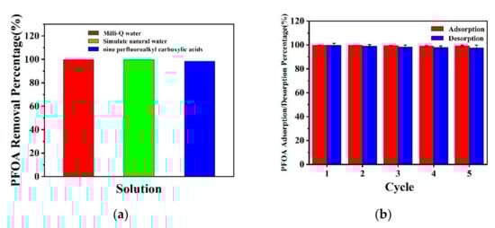 The matrix effect is critical for adsorbents when additional contaminants are present. Therefore, different aqueous mixture solutions, including, Milli-Q water, simulate natural water (200 mg L−1 NaCl and 20 mg L−1 humic acid), and nine perfluorobutanoic carboxylic acid aqueous solutions (1 mg L−1 of each initial concentration) were used to investigate the matrix effect. As shown in Figure 6a, the removal rate of PFOA is almost constant in various aqueous solutions, which indicates that POP-4F has a strong anti-interference ability and an excellent ability to remove PFOA in complex water samples. This indicates that POP-4F has a great potential for treating acidic industrial wastewater and for environmental remediation around the plant.