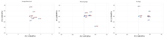 According to Table 2, SC640, KSC704, and SC647 hybrids had the highest index values and were the most tolerant hybrids. Also, the KSC707 was selected as the most sensitive hybrid based on these factors. The GMP, or geometric mean productivity, will be less skewed due to its lower sensitivity to differences between Yp and Ys. In terms of this index, SC647, SC640, and KSC704 hybrids were the most tolerant. The STI, or stress tolerance index, includes yield potential in non-stress conditions, yield in stress conditions, and intensity. According to this index, the SC647, SC640, and KSC704 hybrids were the most tolerant to drought stress, and the KSC707 hybrid was the least tolerant. The KSC707 genotype was more sensitive than other cultivars in terms of this index. According to the study of tolerance indices, SC647 and SC640 can be identified as tolerant genotypes, and KSC707 as a susceptible genotype. The results are based on the harmonic average productivity index (HAR), indicating high-stress-tolerance and high-performance potential [25]. The highest values of water-stress-tolerance were related to SC647 and SC640 hybrids.