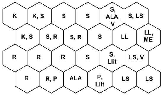 Morphotaxa clusters obtained with USOM allowed an ordering of morphotaxa in groups in partial agreement with habitat types [34,35,36] even if habitat types were not always well separated in different cells; in particular, sites belonging to V, ME, LS, and LL were often included together in the same cell. In addition, sites belonging to K, S, and R were often included in the same cell. In Figure 1, each cell is tentatively assigned to one or more habitat types considering the prevalent number of sites assigned to different habitats.
