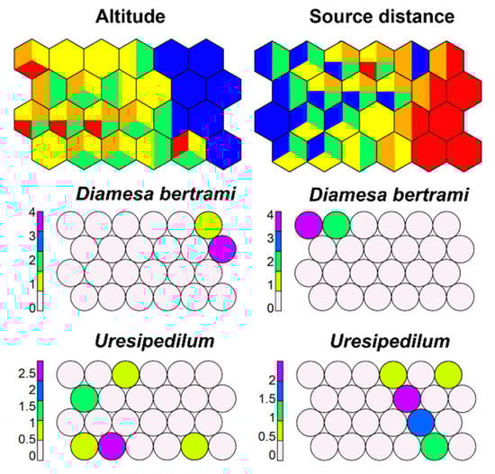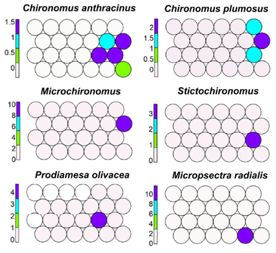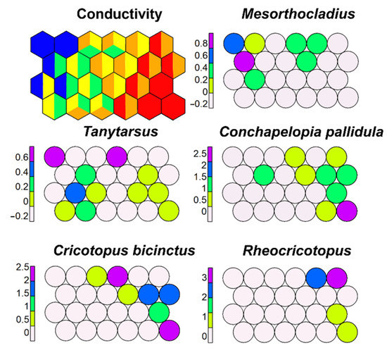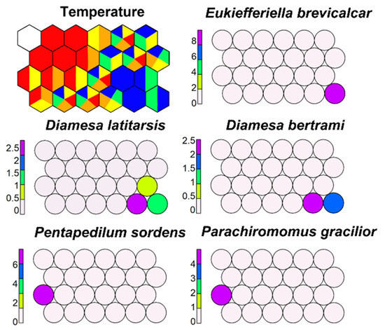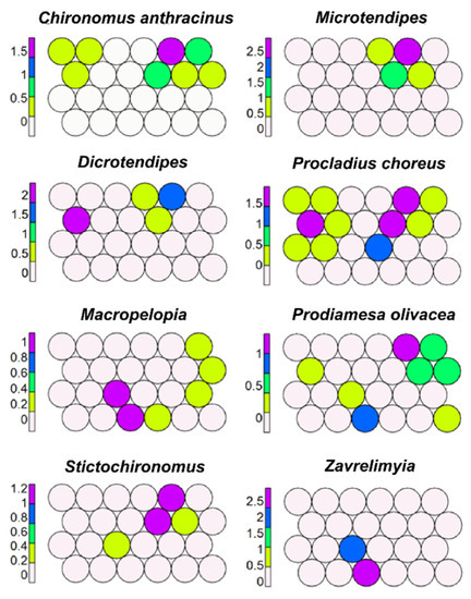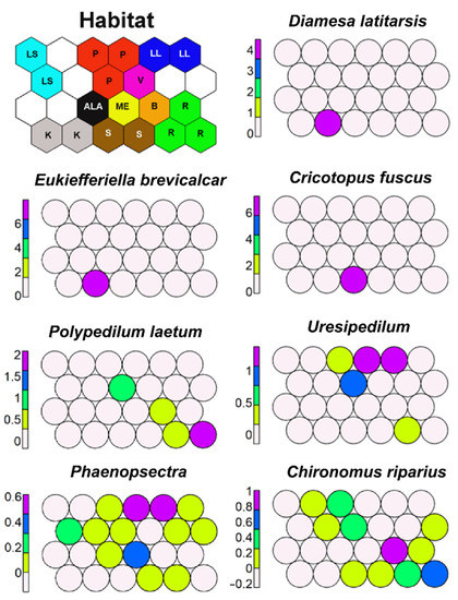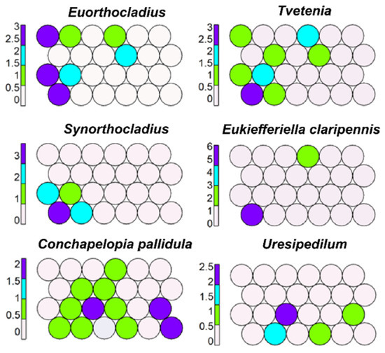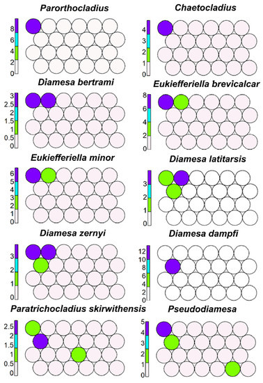 The cold stenothermal taxa living in kryal zone or in cold mountain springs, such as Parorthocladius nudipennis and Chaetocladius, were clustered in cell 19 (Figure 2). Diamesa bertrami, Eukiefferiella brevicalcar, and E. minor were clustered in cells 19 and 20 (Figure 2), D. latitarsis and D. zernyi were clustered in cells 13, 19, and 20; D. dampfi, Paratrichocladius skirwithensis, and Pseudodiamesa inhabitants of cold mountain springs were aggregated in cells 13 and 19 (Figure 2).