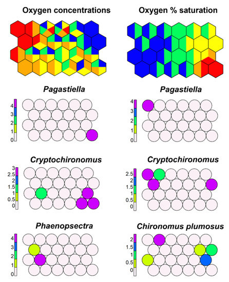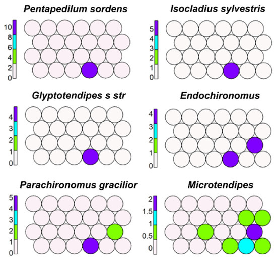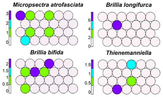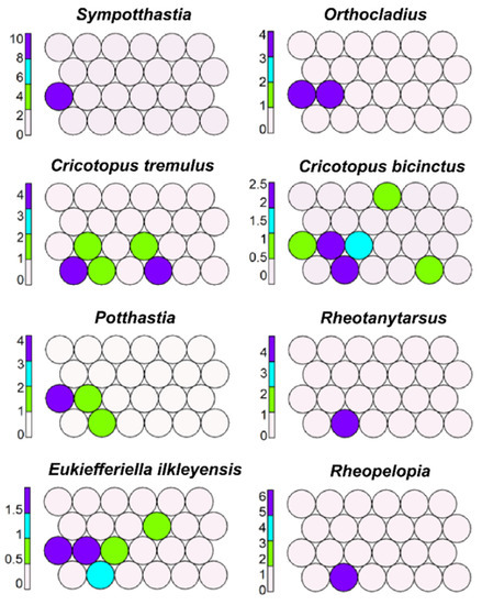Krenophilous morphotaxa, such as B. bifida and B. longifurca, Micropsectra atrofasciata, and Thienemanniella, were scattered in several cells (10, 14–16, 21–23) but were mostly in cells 14 and 22 (Figure 3).