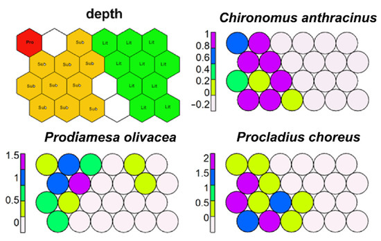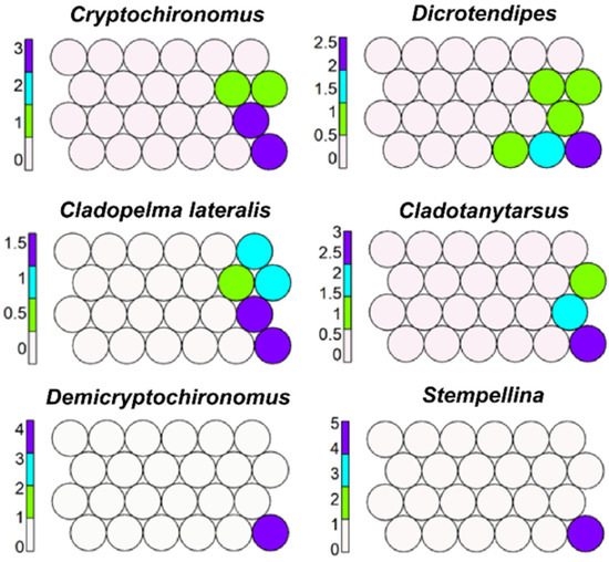 Cryptochironomus, Dicrotendipes, Cladotanytarsus, Demicryptochironomus, Stempellina, and Cladopelma lateralis prevail in cell six and in neighbouring ones (Figure 7); Pagastiella and Parakiefferiella are also mapped here but occur also in small lakes (LS).
