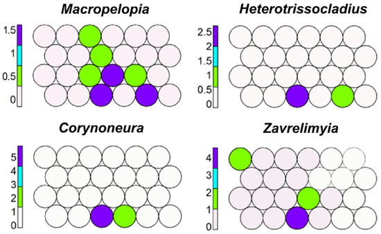 SSOM trained using season as external factor (Figure 19) must be interpreted considering that larval samples include only the fourth instar stage because the first three stages are generally not included in counting as non-identifiable. Most morphotaxa prevail in spring (e.g., Paratrissocladius), but some morphotaxa have their maximum growth in summer, in particular the ones living at high altitude. Morphotaxa living at high altitudes, such as Diamesa latitarsis, were collected both in summer and autumn.