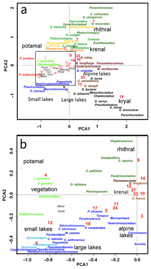 Some taxa, such as C. anthracinus, Microtendipes, Dicrotendipes, and Stictochironomus, prevailed in lakes, while other morphotaxa, such as P. choreus, P. olivacea, Macropelopia, and Zavrelimyia, were widespread in several habitats (Figure 13).