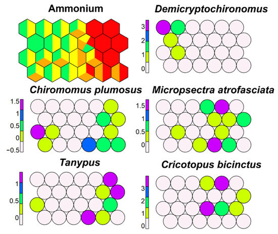 SSOM with NH4 as external variable emphasized again a wide tolerance of many morphotaxa, such as M. atrofasciatata, Tanypus, C. bicinctus, and C. plumosus, while a few morphotaxa were restricted to cells with low NH4 concentrations (Demicryptochironomus) (Figure 18).