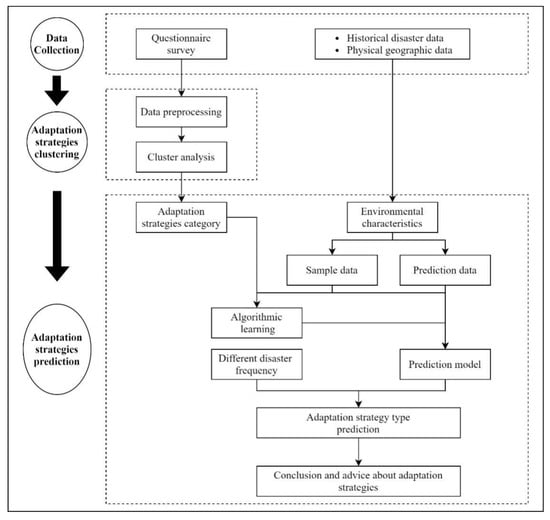 This study followed the methodology flowchart shown in Figure 1. The research was divided into three parts: data collection, cluster analysis of adaptation strategies, and prediction of change in adaptation strategies. Details are provided in the following subsections.