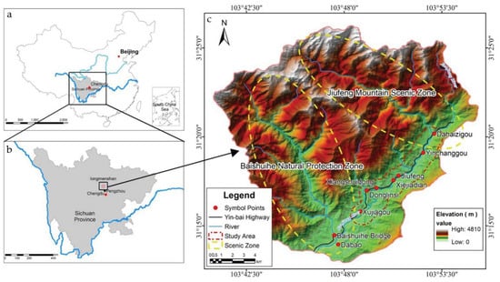 Maps showing the location in (b) Sichuan Province of (a) China, where (c) the study area is situated.