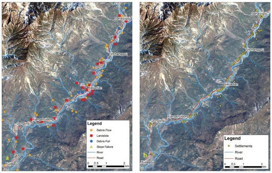 Distribution of co-seismic and post-seismic potential geohazards (a) and settlements investigated (b) in the study area.