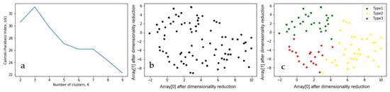 Based on 112 survey responses, the Calinski–Harabasz Index was used to evaluate the results of the K-means clustering analysis. The number of clusters with the highest Calinski–Harabasz Index was three (Figure 4). In other words, when the number of clusters was three, the ratio of between-clusters dispersion and within-cluster dispersion was the largest, resulting in the best partition of the data. This means that the cluster analysis obtained the best clustering results.