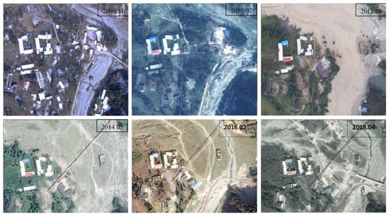 Figure 6 shows an example of an area experiencing Scenario 2, or an increase in the frequency of landslides. The area, called Yingchanggou, is a location where areas covered only by grass have become denuded. One of the biggest debris flows happened in Yingchanggou in 2012, as can be seen in the photo for that year. Due to the high frequency of landslides, recovery and reconstruction in this area were slow, which caused the local residents to prefer to work in places other than in the living place. The adaptation strategies depended on local policies to cover the difficulties in life. The prediction results indicated an increasing number of autonomous adaptation strategies shifting to government policy-dependent adaptation, which were concentrated in the Yingchangou area.