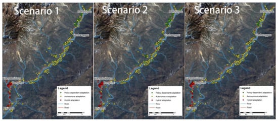 In light of the prediction results in Figure 7, the landslide adaptation strategies applied by the 721 households have distinct spatial distributions. In Scenario 1, those who adapted a hybrid strategy were concentrated in the Xujiagou area along a branch of the Jianjiang river, while the households applying a policy-dependent adaptation strategy were concentrated in the upstream area of the Jianjiang river from Yinchanggou to Dahaizigou. Because of the main traffic connection, the Yin-bai Highway (a province-level road), built along the Jiangjiang river, people living on the Jianjiang riverside were more likely to adapt an autonomous strategy. Despite the fact that the Yin-bai Highway passes the upstream area of the Jianjiang river from Yinchanggou to Dahaizigou, the households there tended to depend on policies and the government due to being far away from cities that have rich work opportunities and social resources. Compared to households living in the upstream area, those who adapted a hybrid strategy lived in Xujiagou, which is along a branch of a downstream area of the Jianjiang river, resulting from inconvenient traffic conditions. In Scenario 2 and Scenario 3, the spatial distributions of adapting three strategies compared to Scenario 1 showed little change. Therefore, distance from cities and road conditions contributed to the choice of adaptation strategy, and households living in a place close to cities and with better road conditions showed preference for the autonomous adaptation strategy.