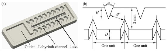 Physical model and structural parameters of the tooth-shaped labyrinth channel emitter. (a) Physical model and (b) structural parameters of the tooth-shaped labyrinth channel unit. N indicates the number of channel units, D indicates the channel depth, α indicates the tooth angle, H indicates the tooth height, and W indicates the channel width.