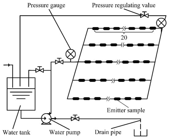 The hydraulic performance experimental platform of the drip irrigation emitter layout is shown in Figure 2. The tap water was used as experimental water. The 3D-printing method was used to manufacture the emitter samples. A total of 5 drip irrigation tapes were installed on the hydraulic performance experimental platform, and 20 emitter samples were installed on each drip irrigation tape, so a total of 100 emitter samples was installed on the hydraulic performance experimental platform.