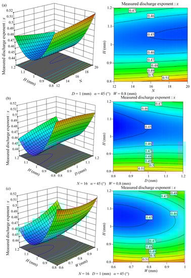 The three-dimensional response surface plot and the contour plot of the interactions between the tooth height and the number of channel units, channel depth, and channel width (N × H, D × H, H × W) on the discharge exponent are shown in Figure 3a–c, respectively. It can be observed from Figure 3 that when the number of channel units, the channel depth, or the channel width changes, the variation range of the discharge exponent with the increase in the tooth height is affected by the changes in the other three structural factors, but the variation trend of the discharge exponent with the increase in the tooth height is same, which first decreased and then increased. However, when the tooth height took different values, the variation trends of the discharge exponent with the increase in the other three structural factors were different. By comparing the variation range of the discharge exponent with the change of tooth height in the three figures, it can be observed that, no matter what, the values of the other three structural factors are the discharge exponent when the tooth height is 1.2 mm, which is significantly smaller than that when the tooth height is 0.8 mm, indicating that moderately increasing the tooth height can reduce the discharge exponent of the tooth-shaped labyrinth channel emitters, but excessively increasing the tooth height is not conducive to reducing the discharge exponent of the tooth-shaped labyrinth channel emitters.