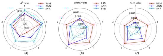 The radar diagrams of 5-fold cross-validation for the three estimation models in terms of R2, RSME, and MAE are illustrated in Figure 4. From an observation of Figure 4a, the 5 R2 values of the SVR model are all greater than 0.95, which are all greater than the corresponding values of the RSM model. Although the ANN model performed slightly better than the SVR model in the second-fold cross-validation, the other four values of the SVR model were greater than that of the ANN model. Comparing the five R2 values of the ANN and RSM models, it was found that the RSM model performed slightly better than the ANN model in the first and third fold of the cross-validation, but the results of the other three-fold cross-validations were lower than those of the ANN model. For the RMSE estimated metric (Figure 4b), the comparison results of the three models were completely consistent with the R2 estimated metric comparison results. In Figure 4c, it can be observed that, for the MAE term, the five values in the SVR and ANN models are all larger than those of the RSM model. The MAE values of the SVR model were lower than that of the ANN model in the second-fold cross-validation and fifth-fold cross-validation, but the other three-fold cross-validation results were better than the ANN model. Overall, in the radar diagram, the RMSE and MAE values of the SVR model had the smallest area and R2 value had the largest area, thus the prediction performance of the SVR model was the best among the three models, and the ANN model was second only to the SVR model.