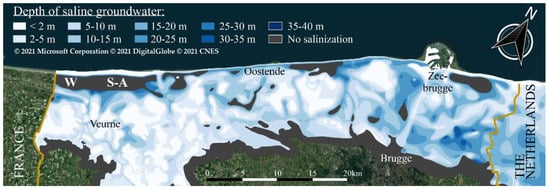 Salinization map of the Belgian coastal phreatic aquifer from De Breuck et al. [34], depicting the depth at which groundwater has a salinity above 1500 mg/L; W and S-A stand for De Westhoek (De Panne) and Sint-André (Koksijde), respectively.