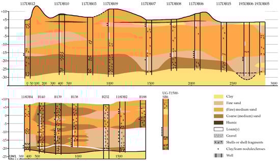 Top: lithological cross section of the dunes of De Westhoek; bottom: cross section of the Doornpanne dunes (Koksijde) and borehole UG-T1500-SB6 within Koksijde-Bad. See Figure 3 for the locations of the boreholes. LWL stands for low water line. The top figure was modified from Lebbe [39,40] and the bottom figure is based on borehole descriptions from the Databank Ondergrond Vlaanderen (DOV, Flanders subsurface database).