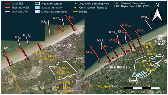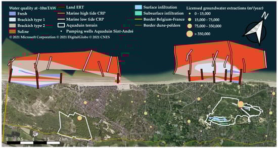 In this paper, we assess and compare the footprints of FSGD in front of the municipalities of De Westhoek (De Panne) and Sint-André (Koksijde). Paepen et al. [15] have already established the zones in which FSGD is present west of De Panne (in front of De Westhoek nature reserve) using ERT and CRP. However, the inversion models were not quantitatively checked. The two zones have similar phreatic aquifer characteristics but different management strategies, allowing the impact of anthropogenic activities to be deduced. At Koksijde, groundwater pumping (above 3 million m³) is combined with MAR, while only limited groundwater extraction occurs at De Panne (pumping rates around 300,000 m³), where zones that are unaffected by anthropogenic activities also occur. The potable water in the dunes is an important source of drinking water, since salt groundwater is found at a shallow depth in most of the area (i.e., the beach and polder area). Moreover, the water demand is relatively high in this region, especially during the touristic summer season, and, in recent years, more droughts have occurred during the summer, putting the groundwater reserves under pressure.