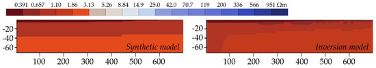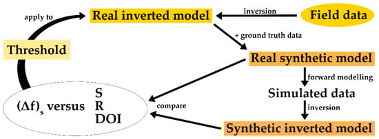 - After forward modelling of this model, the simulated data is inverted to obtain a synthetic inverted model. The same inversion parameters (electrode array, inversion parameters, etc.) are used as for the field data, and the DOI, R, and S are calculated (see Section 3.4.1–Section 3.4.3).