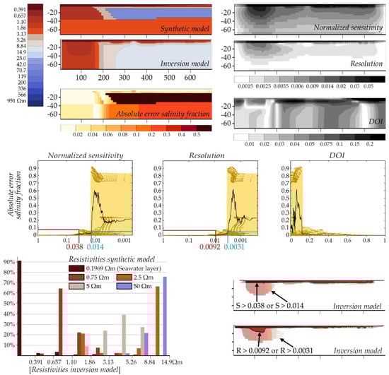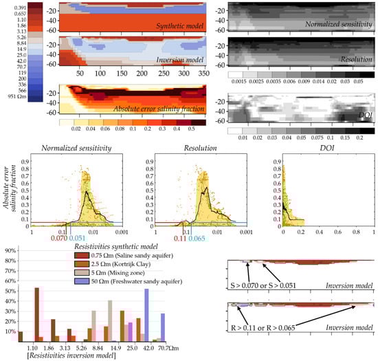 The normalized sensitivity and resolution have similar patterns, they are decreasing with depth, as expected. The DOI is less easily interpreted, only the saltwater layer has a consistently low DOI, while the other zones are more heterogeneous. The plots in Figure 5 show the relationship between the salinity fraction error and the normalized sensitivity, resolution, and DOI. Similar to Caterina et al. [22], a moving average was taken for the normalized sensitivity, resolution, and DOI to visualize the main trends. A window of 100 points was chosen, but a different range for averaging will affect the threshold. For the DOI, the error is consistently above 0.1, even for low DOI values, which is too large for a good quantitative assessment.
