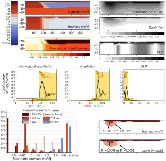 The normalized sensitivity and resolution decrease quickly below the seawater layer. For model S3, the corresponding normalized sensitivity and resolution to an average salinity fraction error threshold of 0.05 are 0.014 and 0.0031, respectively, which is similar to model S4, in which they correspond to 0.019 and 0.0032. These thresholds allow a quantitative interpretation for the seawater layer and the sandy aquifer more offshore to the freshwater discharge, i.e., when it is filled with salt porewater. For the DOI, several low values correspond to a very high salinity fraction error, while high values are observed in the upper part of the model where the error is low. We expect this is a result of the sensitivity of the inversion results to the presence of the seawater layer [9]. This result is in opposition to the sensitivity and resolution and confirms that the DOI is not suited for a quantitative appraisal of the inversion results.