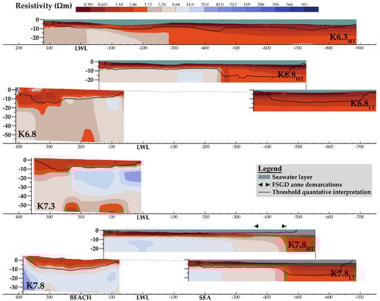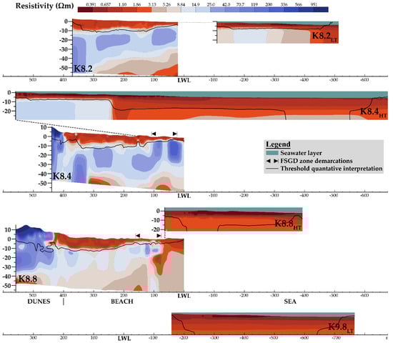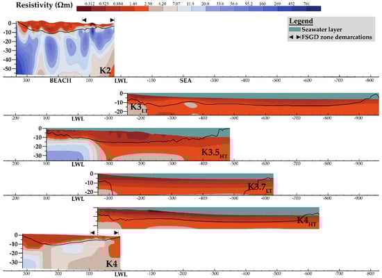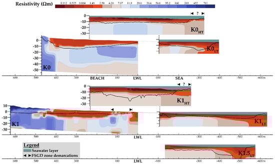 The Belgian–French border (K0) gives an idea on the natural FSGD footprint in the western coast (Figure 12). Paepen et al. [15] showed that there is no freshwater discharge on the beach. The outflow only occurs below the sea level, with discharge likely occurring from approximately 250 m offshore from the low water line and further offshore. However, 1 km to the east ([15], K1), outflow is seen both on the lower beach (25–125 m above the low water line) and offshore (between 200 and 300 m below the low water line). Brackish pore water is seen until 550 m from the low water line. The pore water quality of the brackish/freshwater tongue below the low water line is fresher at K0 compared to K1 after inversion, which can be caused by the discharge of a portion of the fresh groundwater on the beach at the latter location, in which case the water is actually fresher at K0. Another explanation is the thinner portion of the seabed filled with saltwater on top, in which case the apparent fresher water is an artifact of inversion, since this part of the model cannot be interpreted quantitatively.